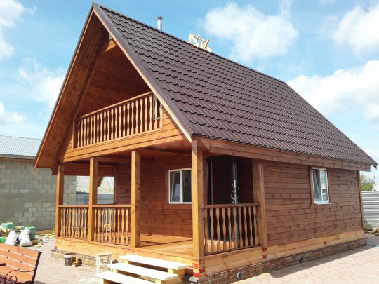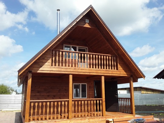 На террасе при условии что она есть делаем перила из строганной доски со всех сторон, столбы террасные также строганные, а не обрезки профилированного бруса с шипом и пазом. Домкратики на столбах для дальнейшей регулировки. Балясины будут сделаны аккуратно. Обратите внимание что в дешёвых случаях это может быть и будет просто вагонка прибирая к неотесанной доске снаружи и столбы будут не квадратные а просто профилированный брус как на видео.