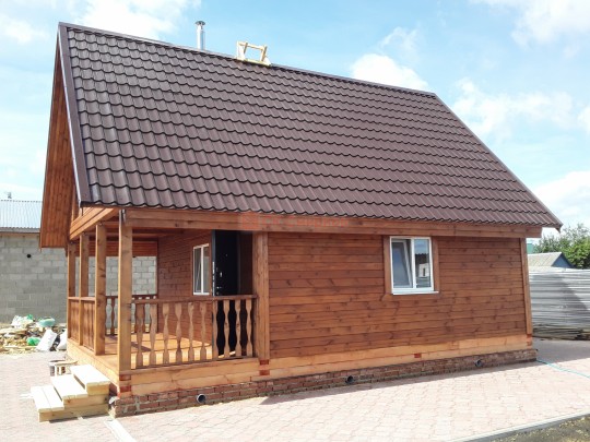 Такая с мансардой баня 6х7 может быть построена из бруса. Ориентировочный срок строительства 27 дней.