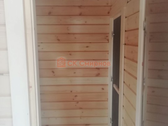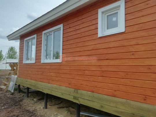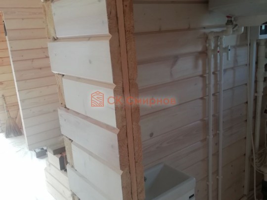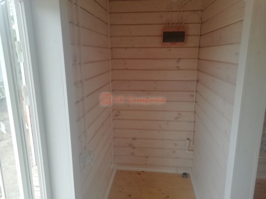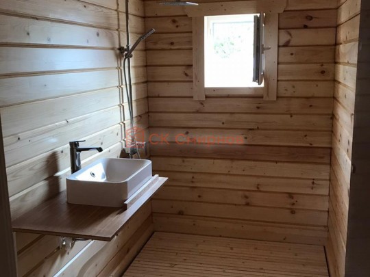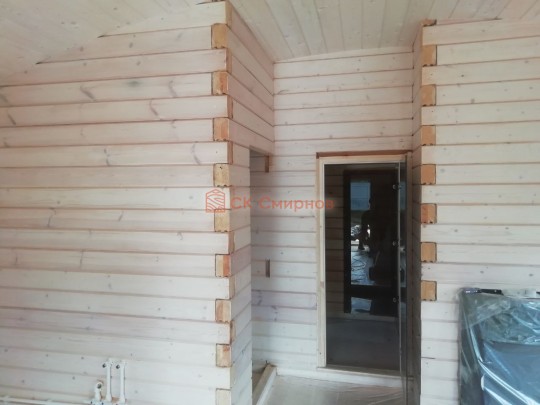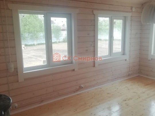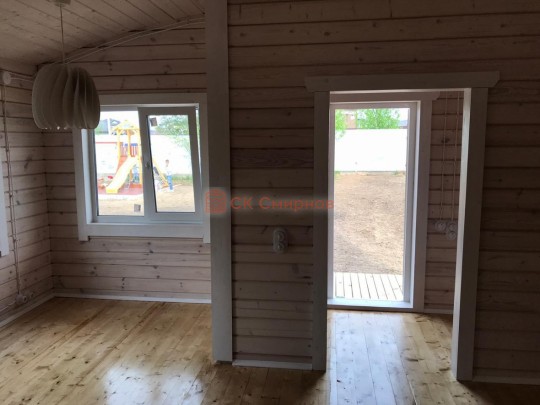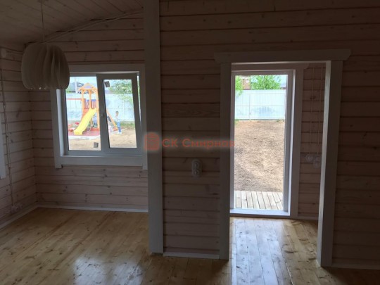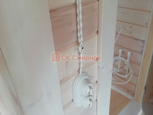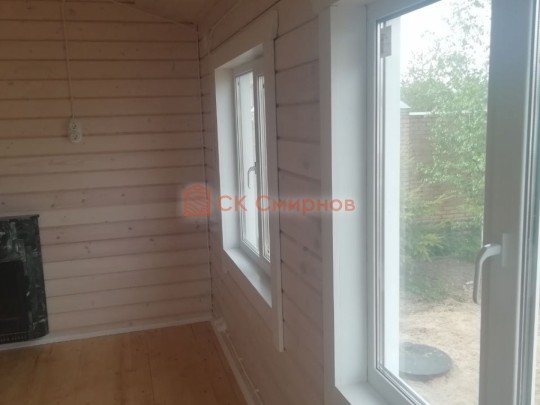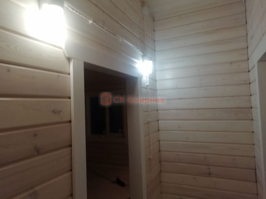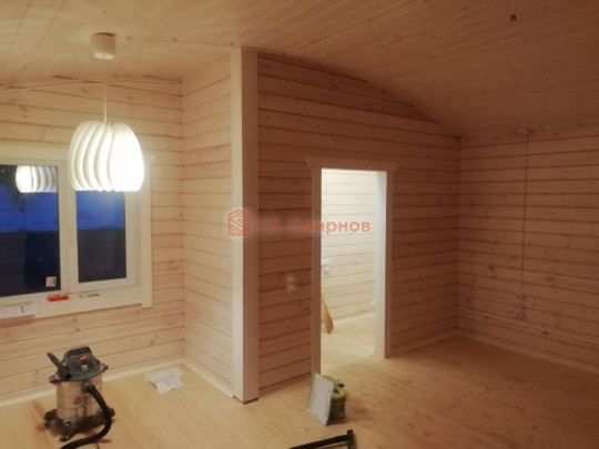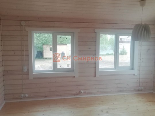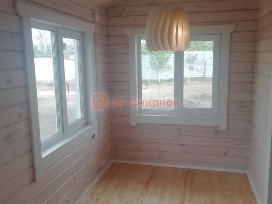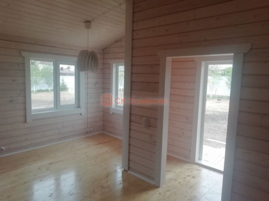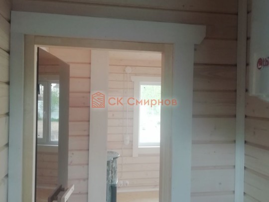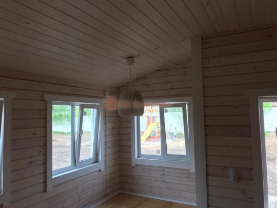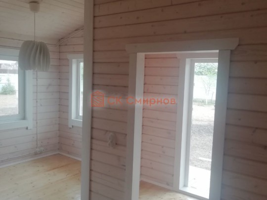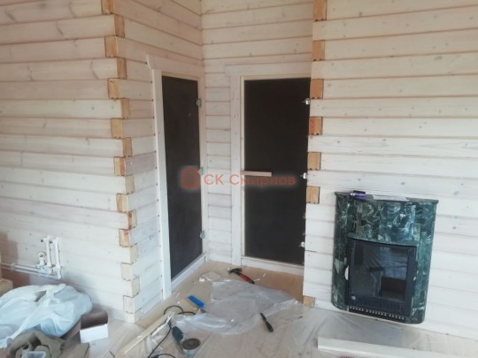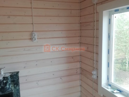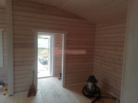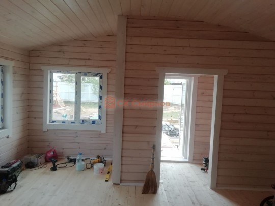 • Отделочные работы. На этом этапе устанавливаются окна, двери, электропроводка, освещение, плинтуса, откосы, печное и душевое оборудование, производится покраска стена снаружи — всё, что предусмотрено договором. В зависимости от объёма работ на отделку может уйти от 3 до 10 дней.