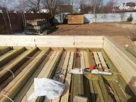 Лаги, обвязку и черновой пол обрабатываем раствором био огне защитой ( зимой оговариваются отдельные условия ), в основном красный цвет, но может быть и бесцветная обработка.