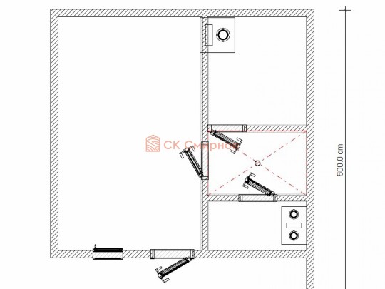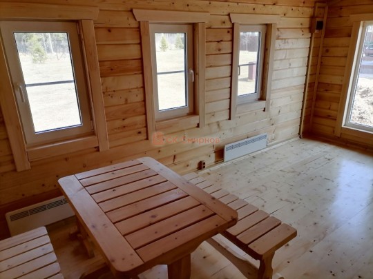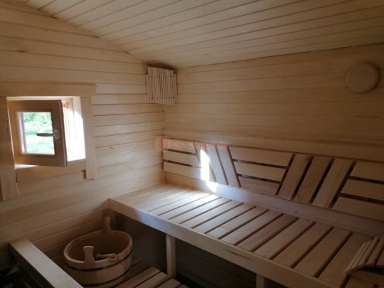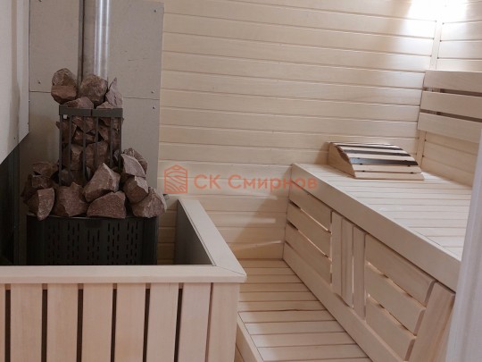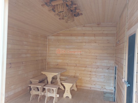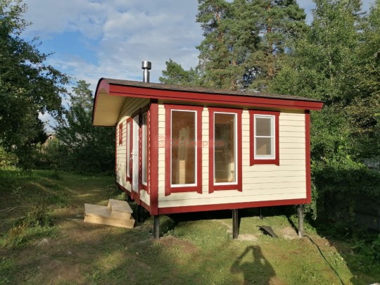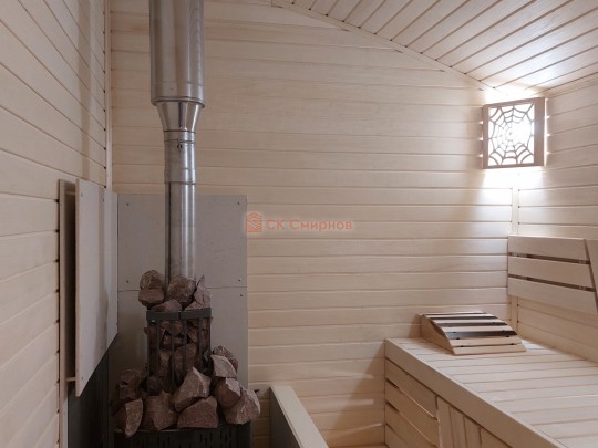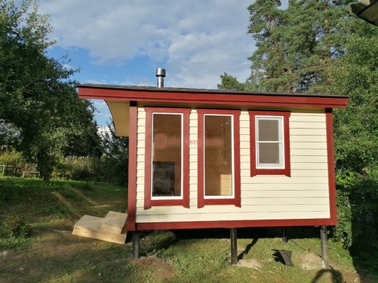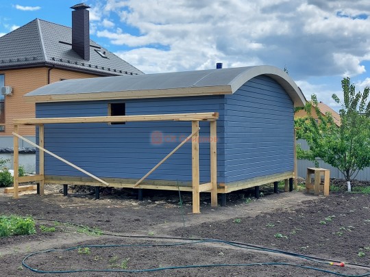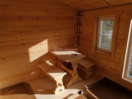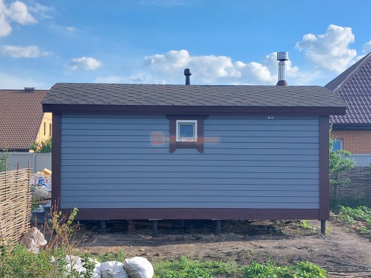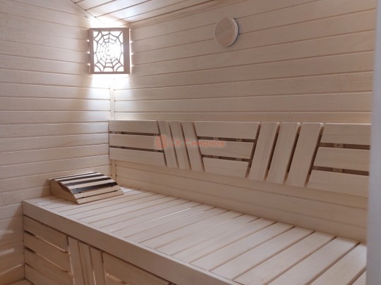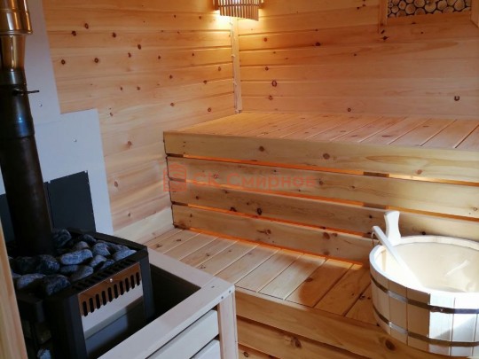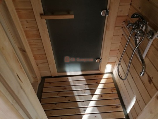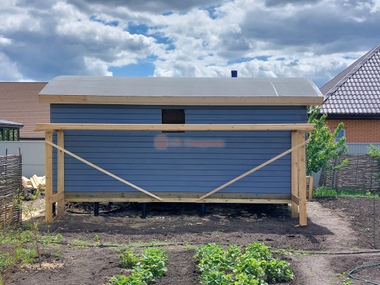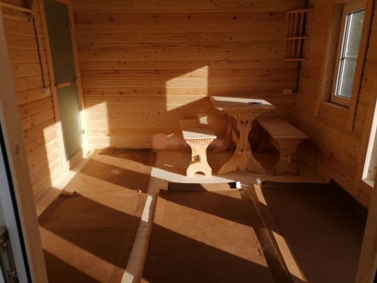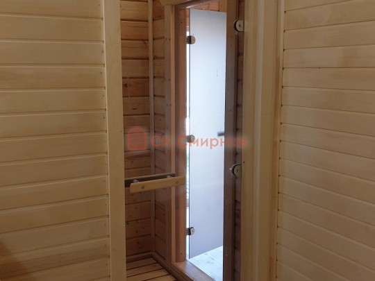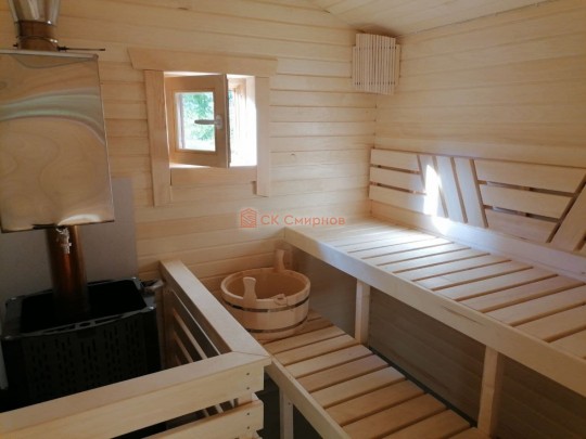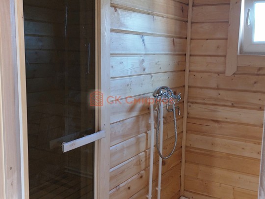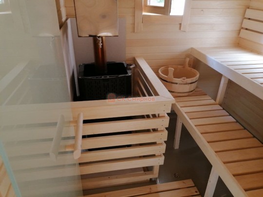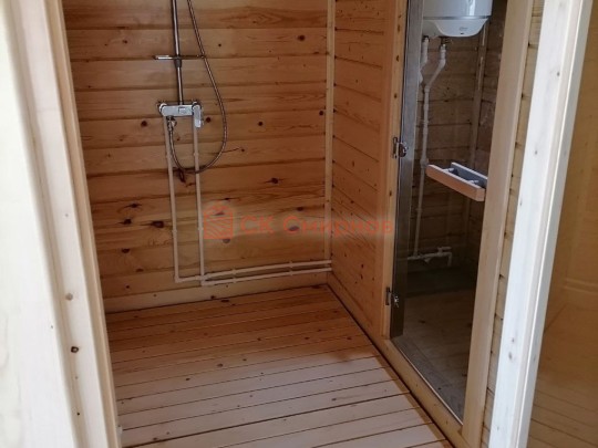 Размер 5,3 на 6 метров. Внутри 4 помещения: комната отдыха, парная, душ и санузел, где размещается душевая система. Ориентировочный срок строительства 10 дней.