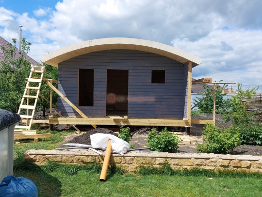 Авторские проект одноэтажной бани «Шале» с необычной округлой крышей, высокими панорамными окнами и небольшой террасой. Такую баню можно построить только из сухого или клееного профилированного бруса в комплектации под ключ. Из бруса естественной влажности и под усадку построить НЕВОЗМОЖНО.