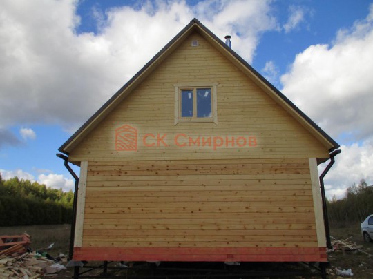 Такая с мансардой баня 6х6 может быть построена из бруса. Ориентировочный срок строительства 17 дней.