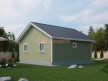 На фото представлен проект минималистичного дачного дома №269 габаритами 8х8 метров и отличной планировкой общей площадью 68 квадратных метров. Можно выделить несколько особенностей проекта: терраса, двускатная крыша, санузел. Это одноэтажный дом с нежилым чердаком, лестницы внутри нет.