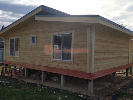 В мае 2020 мы завершили строительство дачного дома из бруса 7 на 9 метров по современному проекту с разноуровневой двускатной крышей. Дом небольшой, но планировка продумана хорошо. На 63 квадратных метрах поместились тамбур, прихожая, две спальни, кухня-гостиная и санузел. Есть большая открытая терраса. Ничего лишнего — все помещения функциональны и неизбыточны.