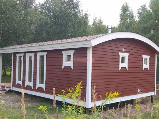 Бани подобного типа мы строим как по каркасной технологии с утеплением и обшивкой доской внахлёст, так и из клееного или сухого бруса. В обоих случаях качество сборки превосходное: баня тёплая, надёжная и очень красивая.